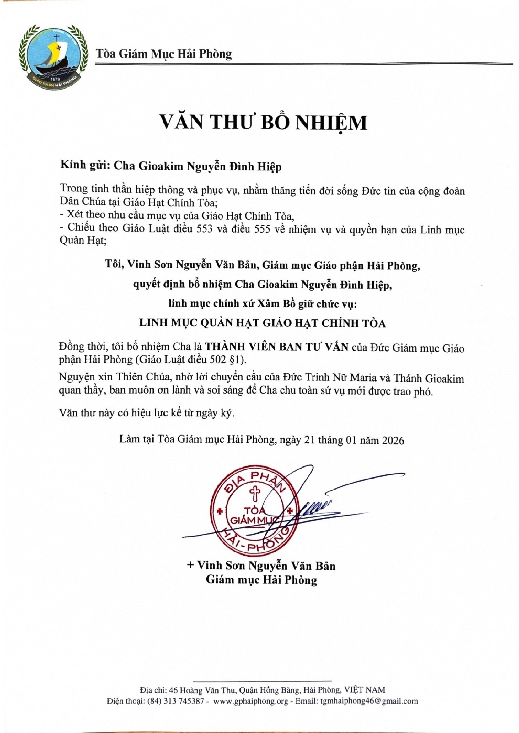 Trong tinh thần hiệp thông và phục vụ, nhằm thăng tiến đời sống Đức tin của cộng đoàn Dân Chúa tại Giáo hạt Chính Tòa; xét theo nhu cầu mục vụ của Giáo hạt Chính Tòa, chiếu theo Giáo Luật điều 553 và điều 555 về nhiệm vụ và quyền hạn của Linh mục Quản hạt; Tôi, Vinh Sơn Nguyễn Văn Bản, Giám mục Giáo phận Hải Phòng, quyết định bổ nhiệm Cha Gioakim Nguyễn Đình Hiệp, linh mục chính xứ Xâm Bồ giữ chức vụ: LINH MỤC QUẢN HẠT GIÁO HẠT CHÍNH TÒA.